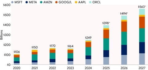 The S&P 500 is over halfway through Q3 earnings season, and results have been impressive. Of the 318 companies that have reported results, 83% have surpassed earnings per share (EPS) estimates, notably above the 10-year average beat rate of 75%, according to FactSet. Growth has been supported by strong margins, which are running close to 13% this quarter. However, most of the attention last week was on capital expenditures (capex) reported by several of the mega cap stocks. Among these names, including Alphabet (GOOG/L), Amazon (AMZN), Apple (AAPL) Meta (META), and Microsoft (MSFT), the message of more spending on artificial intelligence (AI) infrastructure was clear as they collectively spent over $100 billion on capex in Q3. This number is only going to go up, based on guidance to increase spending on AI-related investments. As highlighted in the “Capital Expenditures Surge Across Big Tech” chart, capex among many of the mega cap names is expected to jump from around $400 billion in 2025 to $563 billion by 2027.