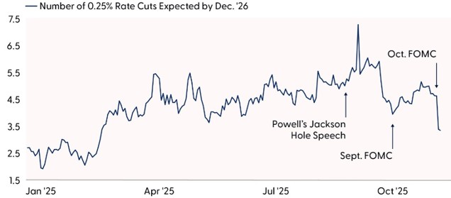 The October FOMC meeting delivered the widely expected 0.25% rate cut, but the tone was notably less dovish than markets anticipated. While the Fed acknowledged rising risks to the labor market and ended QT earlier than planned, Chair Powell’s comments introduced uncertainty around future rate cuts. The lack of clear forward guidance, combined with growing dissent among policymakers, has reduced visibility and increased volatility risk. Treasury yields rose, stocks pulled back, and rate cut expectations were repriced lower, reflecting a more cautious stance from investors.