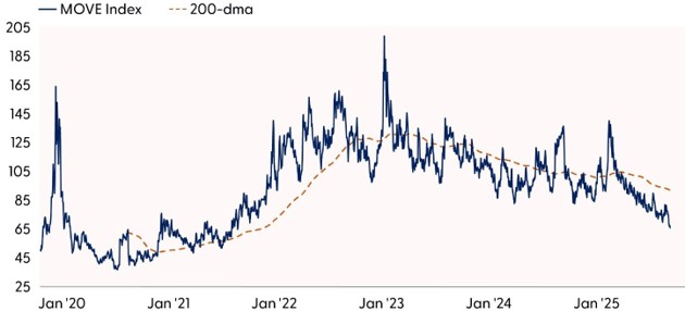 The repricing of rate cut estimates pushed yields higher across the Treasury curve. The 2-year Treasury yield, which is more sensitive to monetary policy than longer tenors, jumped around 12 basis points on the week, while 10-year Treasury yields rose around 10 basis points. Implied Treasury market volatility was more muted. The MOVE Index, a common measure of implied fixed income market volatility, with higher readings equating to higher expectations for 30-day Treasury market volatility and vice versa (like the VIX but for bonds), remained at multi-year lows last week. While the restarting of the rate-cutting cycle, limited economic data due to the shutdown, and seemingly less focus on the deficit is likely contributing to suppressed implied volatility, current levels on the MOVE Index are stretched to the downside. The MOVE Index’s current 66 reading is almost two standard deviations below its longer-term average and represents a historically low 28% discount to its 200-day moving average (dma). With volatility tending to mean-revert, an uptick in implied Treasury market volatility from here shouldn’t come as a surprise.