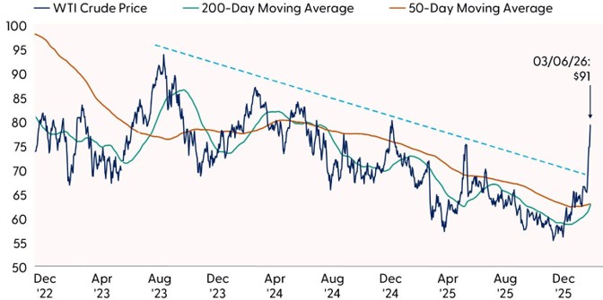 It’s difficult to separate the human and emotional side of war from the economic and market impacts. Without minimizing the human element, we focus on markets here. From that perspective, the energy market is the primary way through which this crisis will affect markets globally. Oil and natural gas production and transit have already been disrupted, sending prices sharply higher. If these disruptions are severe and long lasting, they have the potential to influence inflation expectations, weigh on business confidence, and elevate volatility across asset classes, all of which will likely translate into lower stock prices. Simply put, the more intense and prolonged the geopolitical shock, the larger the likely market impact.