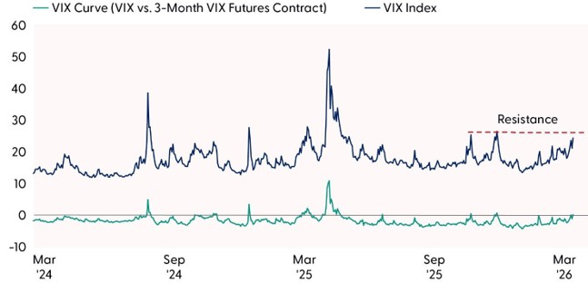 Because volatility tends to revert to its long-term average, the VIX is most useful at its extremes. Low readings can indicate investor complacency, while high readings may suggest markets are nearing peak fear. The recent jump in implied volatility has pushed the VIX to its highest point since last fall. A decisive move above the November closing high at 26.42 would imply additional upside risk in the fear gauge. Conversely, a failure to break above that level, particularly if it occurs alongside a shift back to a normal, upward-sloping VIX futures curve, could indicate that fear is topping out. At present, the futures curve is in backwardation, with near-term contracts priced above longer- dated ones, a rare pattern typically associated with acute market stress. A return to contango, the normal shape of the curve in which longer-term futures trade at a premium to near-term contracts, would suggest that peak fear may have been reached. Plus, the volatility of the VIX does not reflect elevated longer-term fear, which we take as an encouraging sign that the market is confident that this conflict will be over in relatively short order and that lasting damage to global energy infrastructure will be limited.
