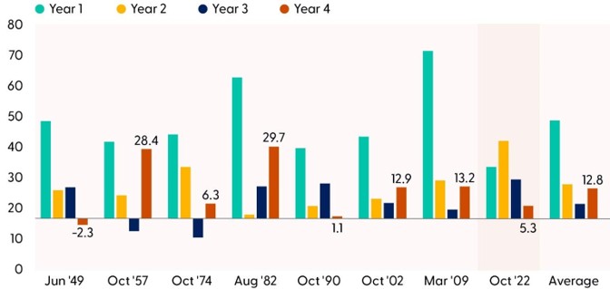 Disclosures: Only S&P 500 bull markets that made it through a fourth year are shown, in addition to the current bull market. All indexes are unmanaged and cannot be invested in directly. Past performance is no guarantee of future results. The modern design of the S&P 500 stock index was first launched in 1957. Performance back to 1950 incorporates the performance of the predecessor index, the S&P 90.