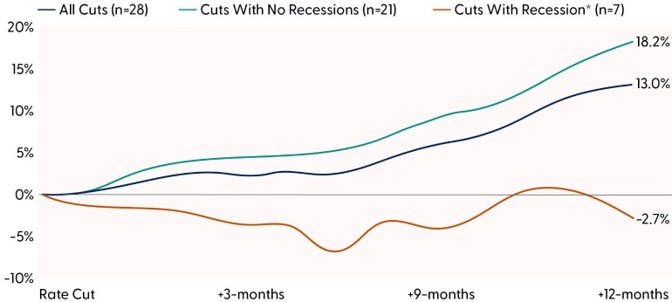 This rate-cutting cycle is unique because stocks are near all-time highs. In previous instances when the Fed cut rates and stocks were at or near record highs (we found 28 cases), the S&P 500 was 13% higher on average 12 months later, with 93% of those 28 periods producing gains. Filtering that further, when the U.S. economy was not in recession around a rate cut, the average 12-month return for the S&P 500 increased to 18%, with gains in all 21 periods. Near recessions, the S&P 500 lost 2.7% on average in the 12 months after the Fed reduced rates, with only 25% of periods generating a gain.
