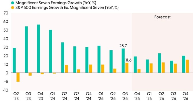This is a favorable backdrop for stocks to at least hold their valuations. But even if corporate profits grow double digits this year and next, it’s difficult to make a case for a higher price-to-earnings ratio (P/E) than the current 22 to 23 times. A growing economy will drive similar mid-single-digit revenue growth as in 2025, while margins are expected to inch higher as tariffs are fully absorbed and benefits from AI increasingly permeate, enabling the potential for double-digit earnings growth.