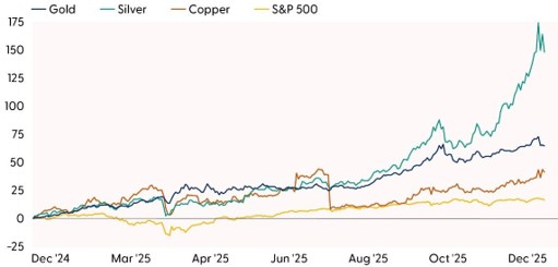 Silver, or as some call it, “poor man’s gold,” stole the spotlight from gold in 2025 after delivering a remarkable 148% price return, marking the best year for the metal since the Hunt Brothers unsuccessfully tried to corner the market in 1979. Within industrial metals, copper climbed 41% amid a volatile path shaped by tariff expectations. Outside of these mainstream metals, platinum and palladium delivered notable gains of 127% and 78%, respectively, contributing to a year in which nearly all metals moved higher.