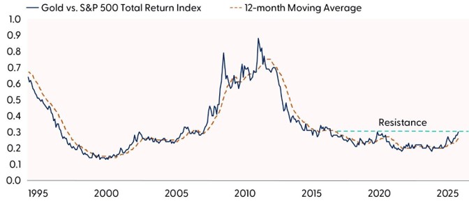Gold delivered a strong performance in 2024, rising 27% on the back of a steady stream of new highs. As 2025 began, investors were left questioning how much further the rally could run and how gold — an asset with no technological underpinning — could continue to outshine a market fueled by artificial intelligence (AI) enthusiasm. Today, those same questions remain. While no one has a crystal ball, technical analysis provides a framework for evaluating the relative trend between gold and equities and assessing the probability of its continuation.