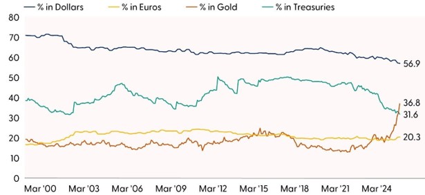 - Weaker U.S. Dollar and Debasement Trends: A weaker U.S. dollar helped fuel the metals rally by making gold and silver more appealing to global investors. At the same time, mounting concerns over expansive fiscal spending, rising debt burdens, questions around Fed independence, and ongoing signs of dollar debasement added further momentum to the melt‑up in metals. Although we do not believe the dollar is at risk of losing its reserve‑currency status — given the lack of a viable alternative — central banks continue to diversify away from the greenback and U.S. Treasuries. This shift in reserve behavior traces back to the 2022 seizure of more than $300 billion in Russian dollar assets following the invasion of Ukraine, an event that reshaped perceptions of currency safety. As shown in the “Foreign Reserve Holdings by Asset,” gold has now surpassed both Treasuries and the euro as a share of global reserves, making it the second‑largest holding behind the dollar.