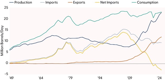 Lower oil “intensity” — less oil used per dollar of economic output — means energy shocks have a smaller impact on growth than in past decades. And from the supply side, the U.S. is now a net exporter of petroleum products.